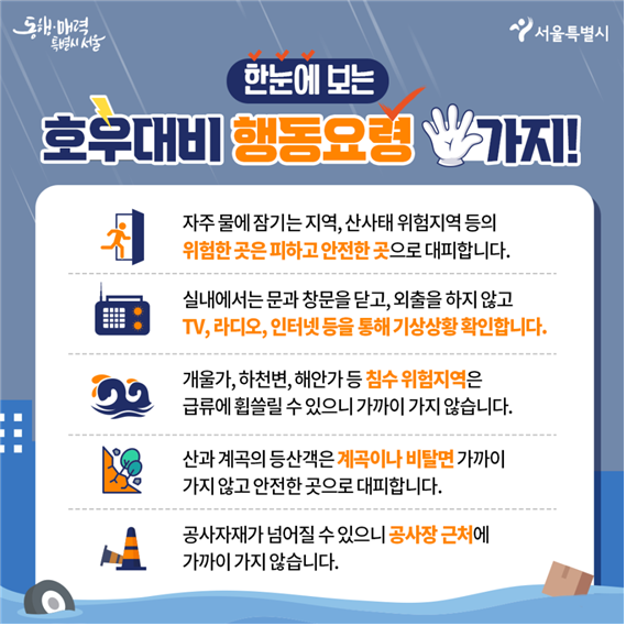 - 반지하 방에 거주하시는 분들은 안전 방송에 귀 기울이며 항상 위급상황에 대비